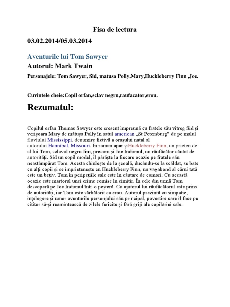 Fisa De Lectura Aventurile Lui Tom Sawyer