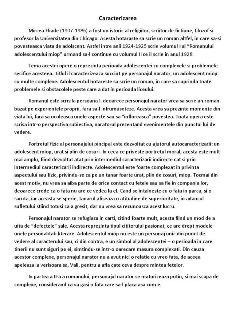 Caracterizarea Pers Principal Din Romanul Adolescentului Miop