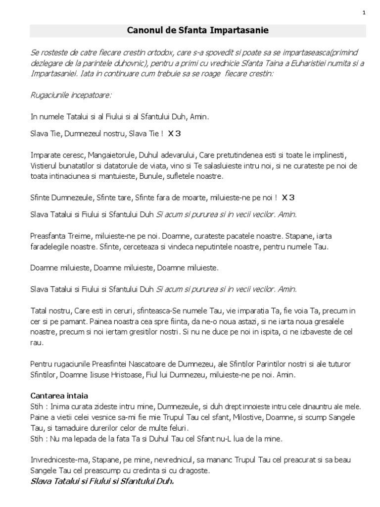 Ci stapane iubitorule de oameni care pentru noi ai murit si ai inviat si ai daruit noua acceste infricosatoare si de viata facatoare. Multumesc tie ca pe mine nevrednicul a ma impartasi cu preacuratele tale daruri m ai invrednicit. Sufletul meu l a intors povaţuitu m a pe cararile dreptaţii pentru numele lui. La loc cu pasune acolo m a salasluit.