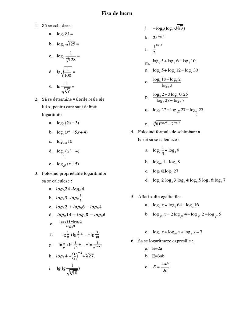 Fisa De Lucru Logaritmi