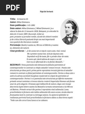 Scrisoarea a 3 a rezumat. Prima parte reprezintă trecutul glorios al ostașilor români în contrast cu falsul patriotism al contemporanilor. Rezumat scurt al poeziei scrisoarea 3 scrisă de marele poet român mihai eminescu si publicata de acesta in anul 1881 in revista convorbiri literare. Eminescu exprima spiritul romanesc asa cum dante exprima spiritul italian shakespeare spiritul englez cervantes spiritul spaniol goethe spiritul german voltaire spiritul francez iar puskin spiritul rus. Rezumat scrisoarea a iii a.