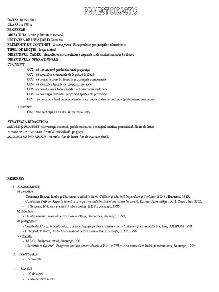 Doc Proiect Didactic De Lungă Durată La Limba Si Literatura Romană Pentru Clasa A Viii A Gimnaziul Taraclia De Salcie Academia Edu