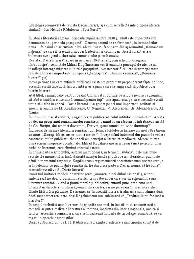 Dacia Literara Ideologia Promovată De Revista Dacia Literară Asa Cum Se Reflectă Intr O Operă Literară Studiată Ion Heliade Rădulescu Sburătorul